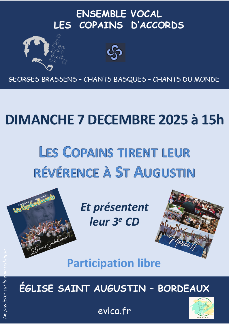 Ls Copains tirent leur révérence à l’église ST AUGUSTIN + Ajouter à mon Agenda Google + iCal / Outlook export Date Déc 22 2025 Heure 15 h 00 min - 17 h 00 min Catégorie Concert Rechercher : Commentaires récentsArchives Catégories Aucune catégorie Méta Connexion Flux des publications Flux des commentaires Site de WordPress-FR